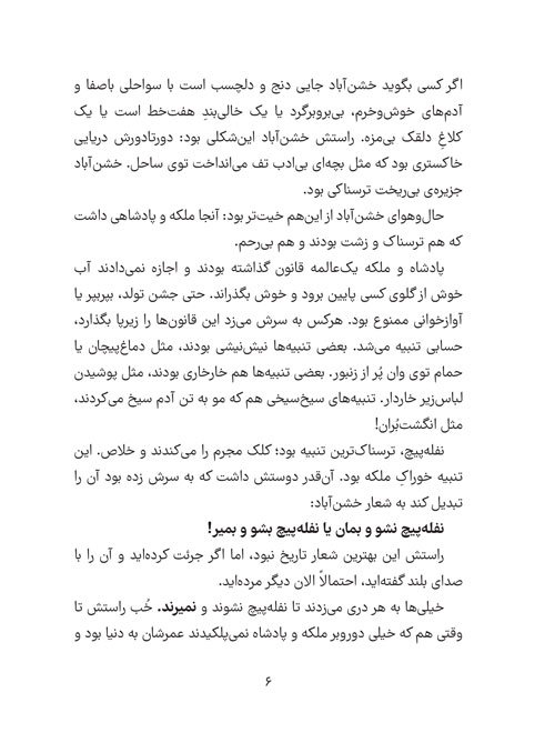 به خشنآباد خوش نیامدید! اگر کسی بگوید خشنآباد جایی دنج و دلچسب است یا یک خالی بند هفت خط است یا یک کلاغ دلقک بیمزه! پادشاه و ملکهی خشنآباد...